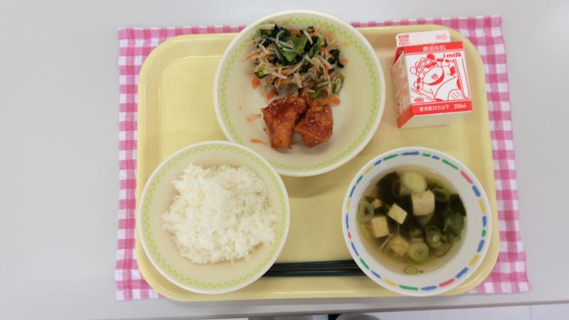 ごはん ヤンニョムチキン もやしナムル わかめスープ 牛乳