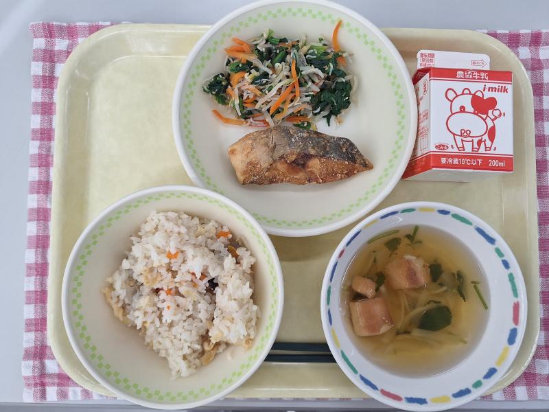 視力回復炊き込みごはん ジューシーぶりの竜田揚げ うまうまほうれん草のおひたし すまし汁 牛乳