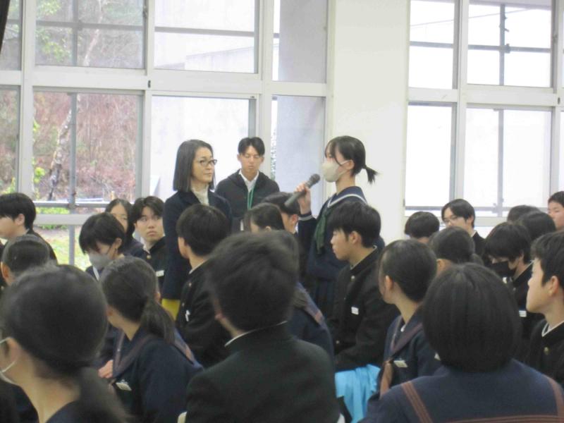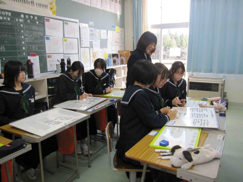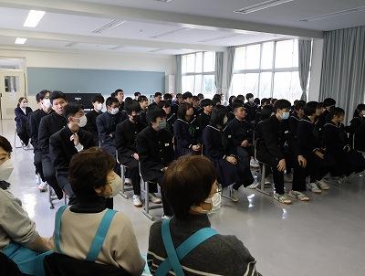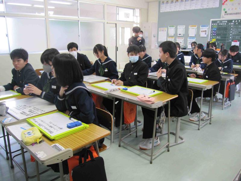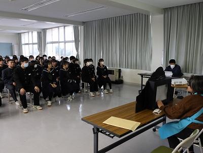 海洋教育の一環で、毎年大学教授をお招きし、海に関するお話を聞いています。今年は、2年生が柳田中学校と合同で、東京大学の原田尚美教授から、「南極と北極」「第66次南極観測隊の経験から」と題して、科学的なデータや観測隊として南極に行かれた経験を交えて、たくさんの貴重なお話を聞くことができました。最後に先生から「今、自分がいる場所が全てではなく、地球規模で考え行動してみよう」と、メッセージをいただきました。また、生徒からのたくさんの質問にも丁寧に答えていただき、ありがとうございました。