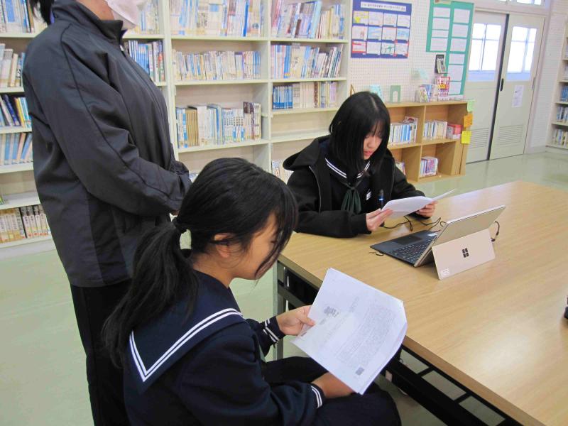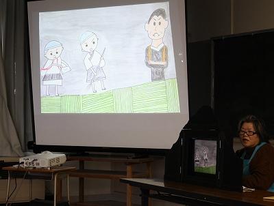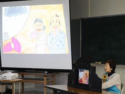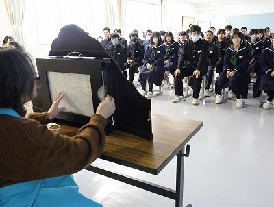 松波小学校では、地域に伝わるお話を探究し紙芝居を制作して表現する活動をしています。松波中学校の1年生から3年生の松波小卒業生が、当時制作した紙芝居が製本され、お話ボランティア「ひまわり」の皆さんから読み聞かせをしていただきました。「願成寺のお厨子の龍」「おとらの長持ち」「浜谷七郎兵衛物語」3話とも、とても上手につくられており、じっくりと聞くことができました。また、生徒たちは自分が描いた絵が紹介され、どきどきわくわくしながら聞いていたようです。