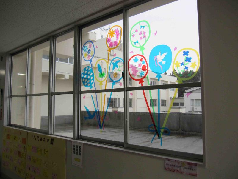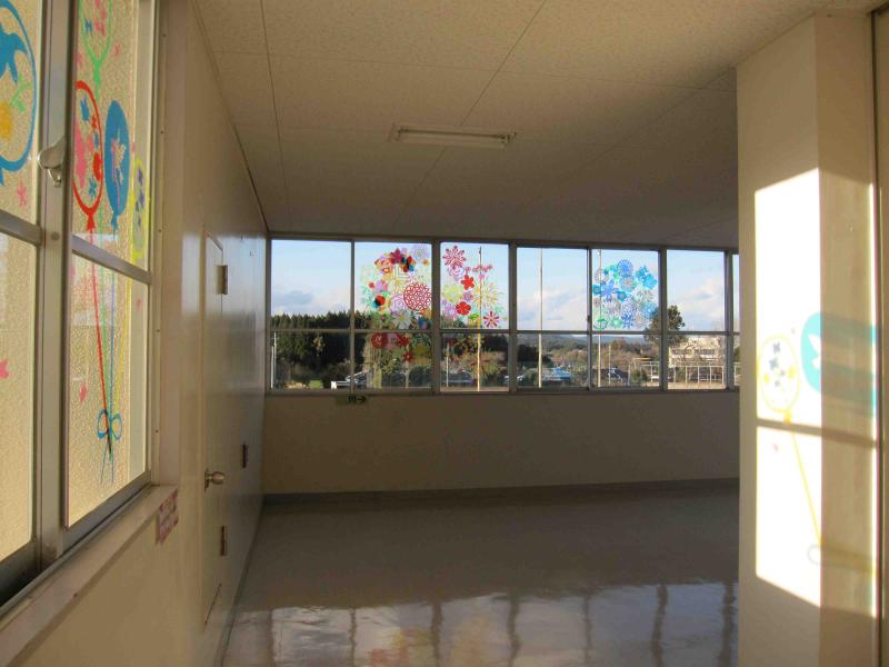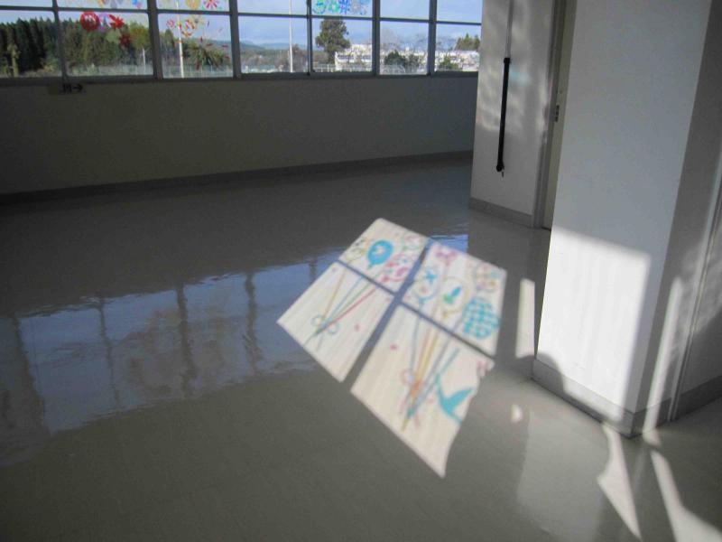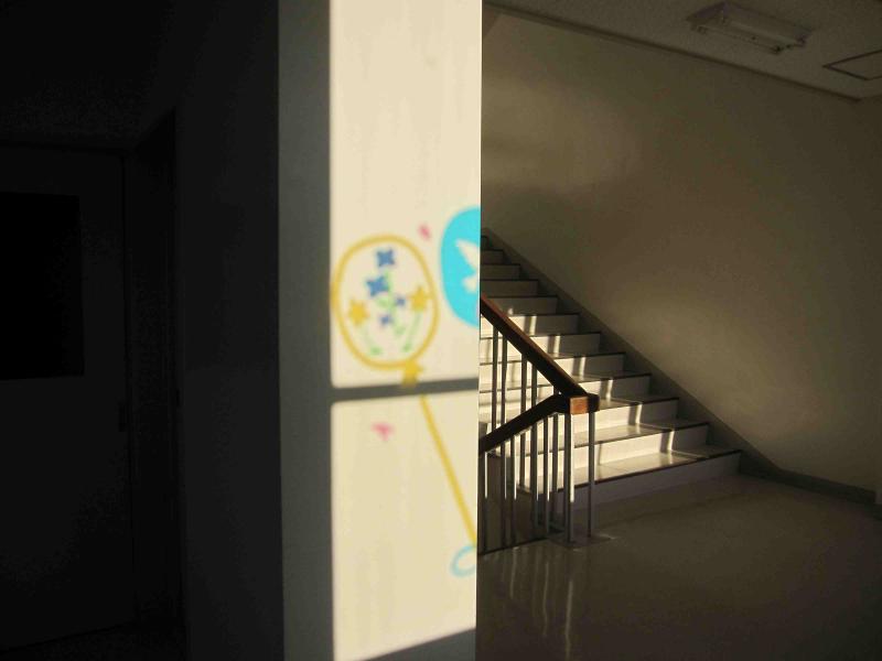 本校の職員室は2階にあり、玄関から入って階段を上っていくと…正面のガラス窓に貼られた昨年度の卒業生の作品が目に飛び込んできます。先日、とてもよく晴れた日、白い柱にきれいに映し出された模様を見ることができました。暑い夏には、強い日差しが憎らしく、気がつくことは無かったのですが、今は少しでも日差しが恋しい季節なので「ぽかぽかとあたたかいなあ~」と廊下を歩いていたところ、「わ~!きれいだな~」と思わずパチリ。学校がアートになった瞬間でした。