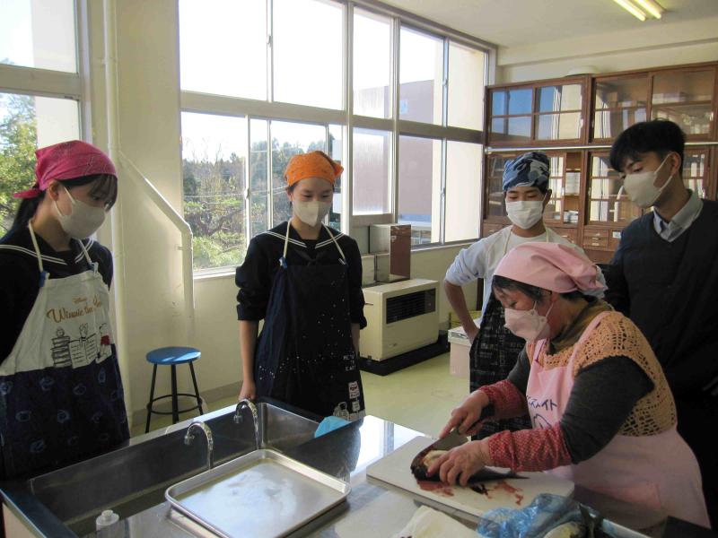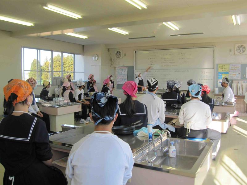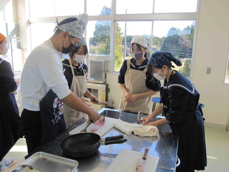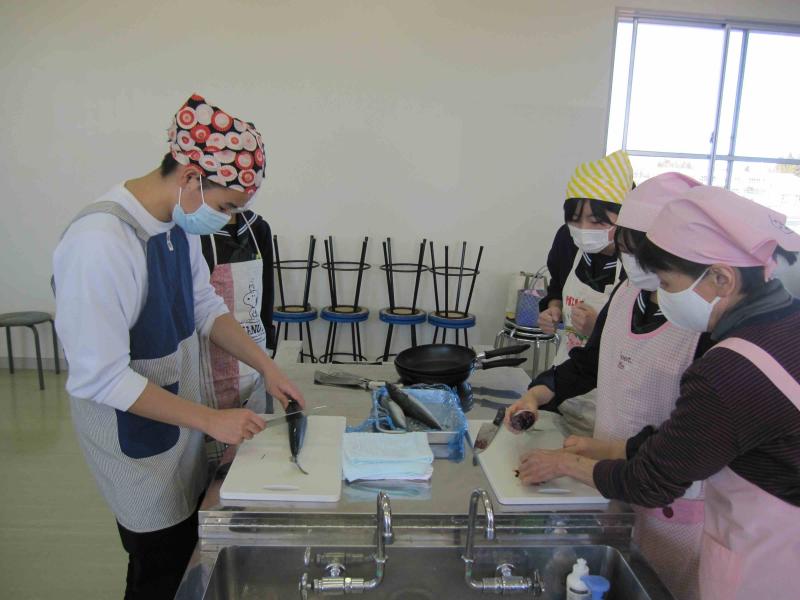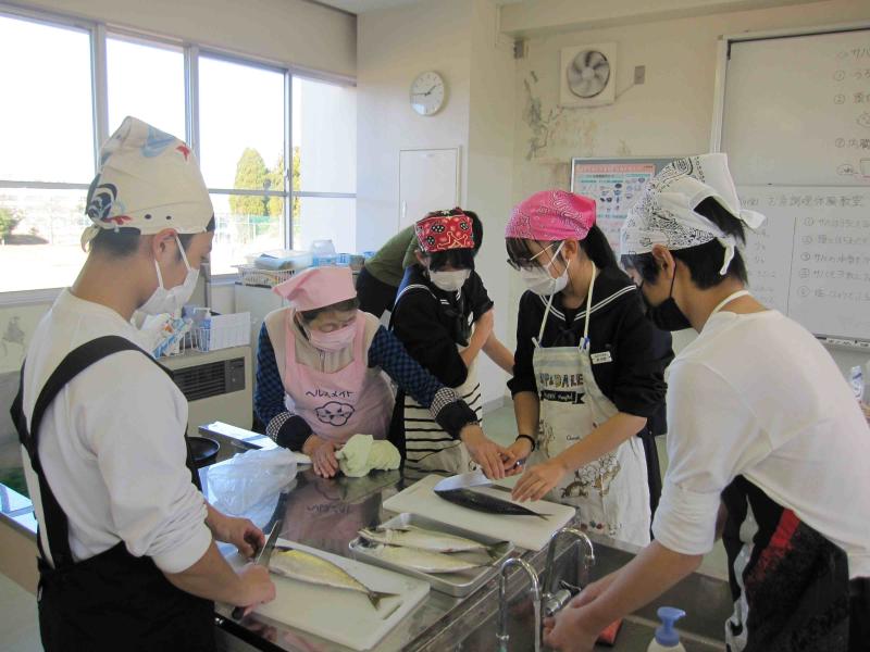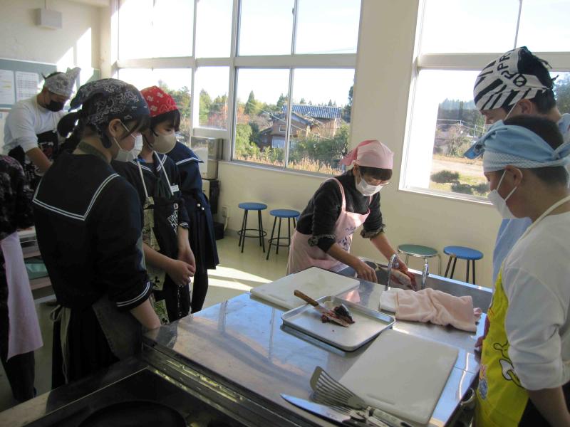 能登町では中学生を対象に「地場産魚の調理体験を通じ、魚に関する理解を深め豊かな食文化の継承と食育の推進を図る」目的で、調理体験をしています。今日は、2年生が地元で採れた「鯖」を調理しました。食生活改善推進員の方々が丁寧に捌き方を指導してくださり、生徒たちは一生懸命「3枚おろし」に挑戦しました。初めて捌く生徒がほとんどでしたが、積極的に活動し、捌いたものはムニエルにして、温かいうちに試食しました。職員室にも試食が届き、いただきましたが、バターの風味とレモンの酸味がきいていて、とっても美味しかったです!生徒たちにとって、とても貴重な体験となりました。