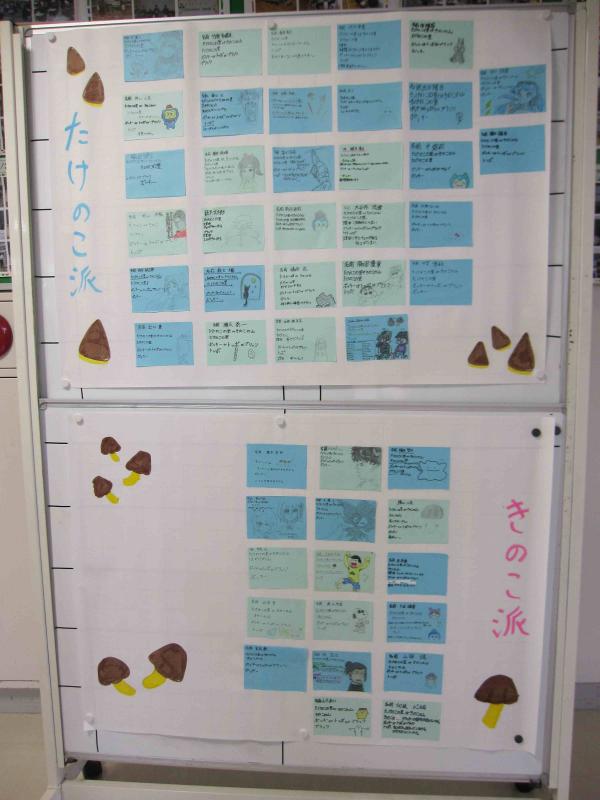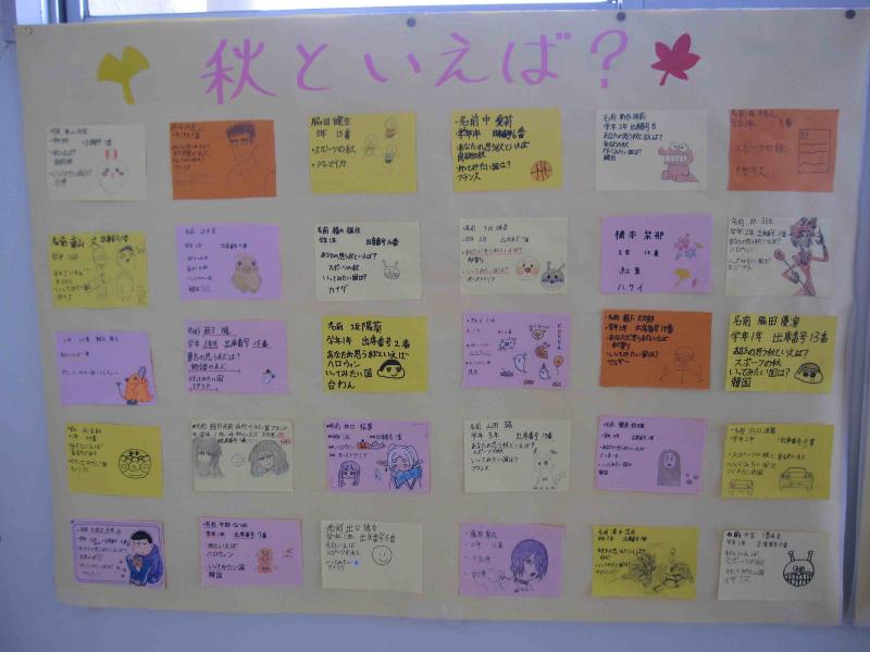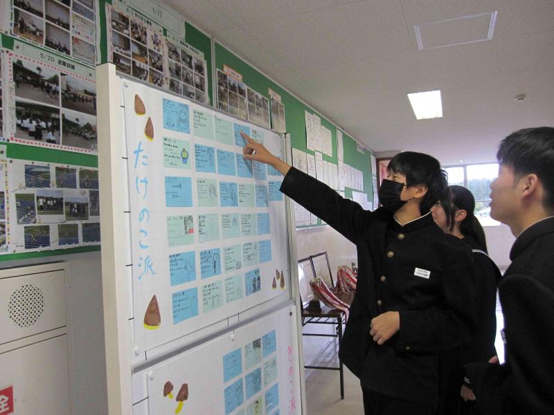 生徒会の各学年学級代表が中心となって、テーマに沿って自分のことを伝える「全校プロフィール」を企画・実行しています。これまでに「自己紹介」「全能登大会への意気込み」「1億円あったら…」「秋と言えば…」「行ってみたい国は?」などをテーマに、一人一人がプロフィールカードを作成して掲示しています。今回は、「お菓子を選ぶならどっち派?」というテーマで、会話が弾んでいました。