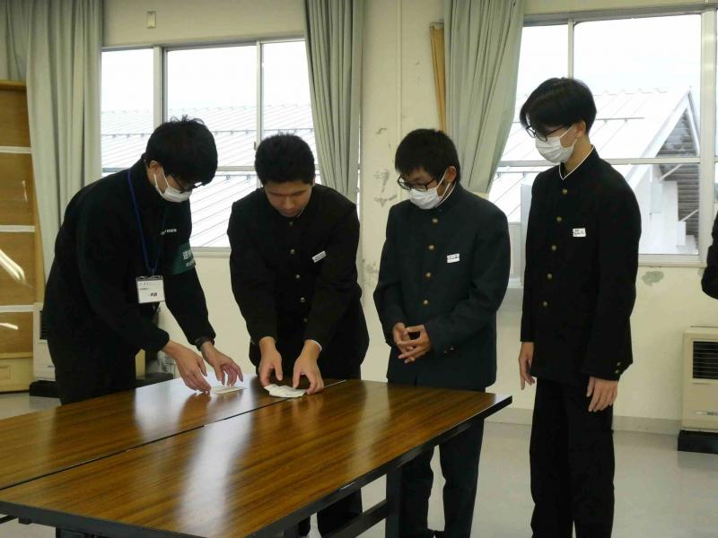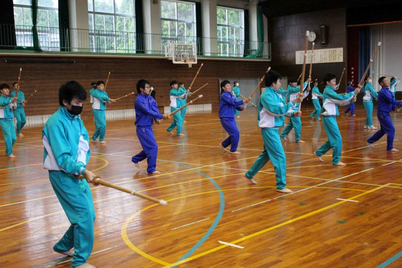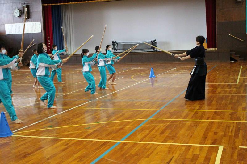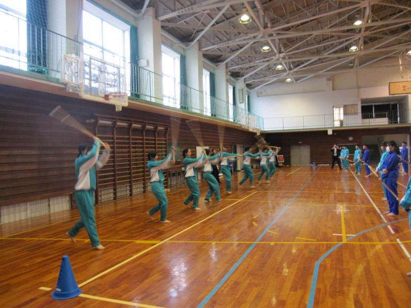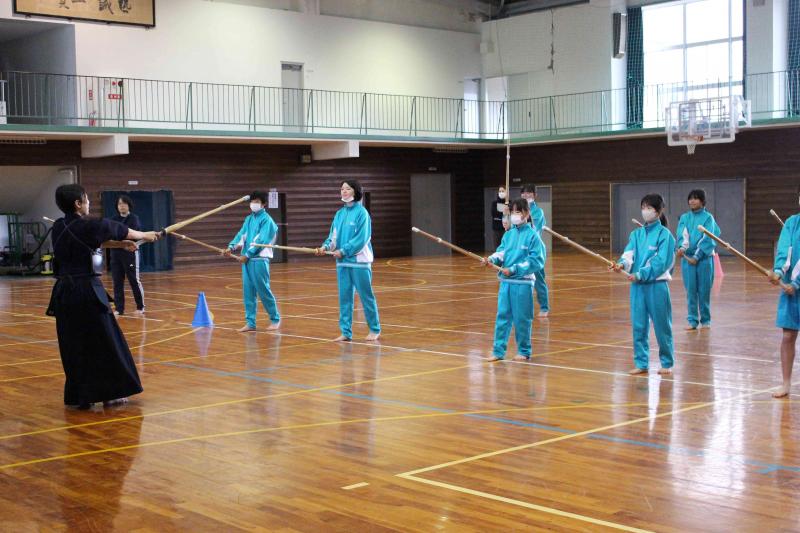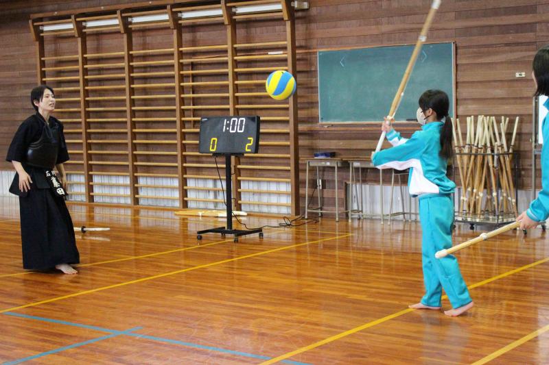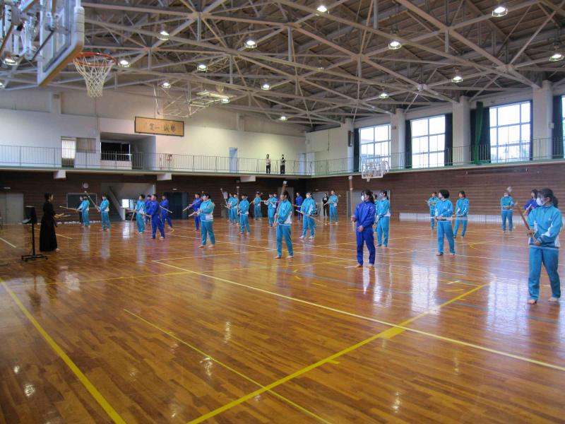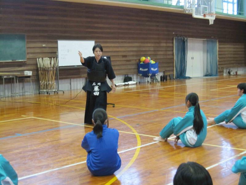 本校では、保健体育科で必修となった「武道」の中から「剣道」を選択し学習しています。今日は、金沢高等学校の藤田裕佳先生をお招きし、全校生徒で剣道の礼法・すり足・面打ちを教えていただきました。剣道部の生徒が活動モデルになり、生徒は練習イメージを持ちやすかったようです。練習方法では、リレーや鬼ごっこを取り入れたり、ペアになってボールを打ったりと、楽しく活動し技能を学んでいました。