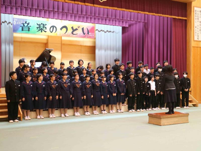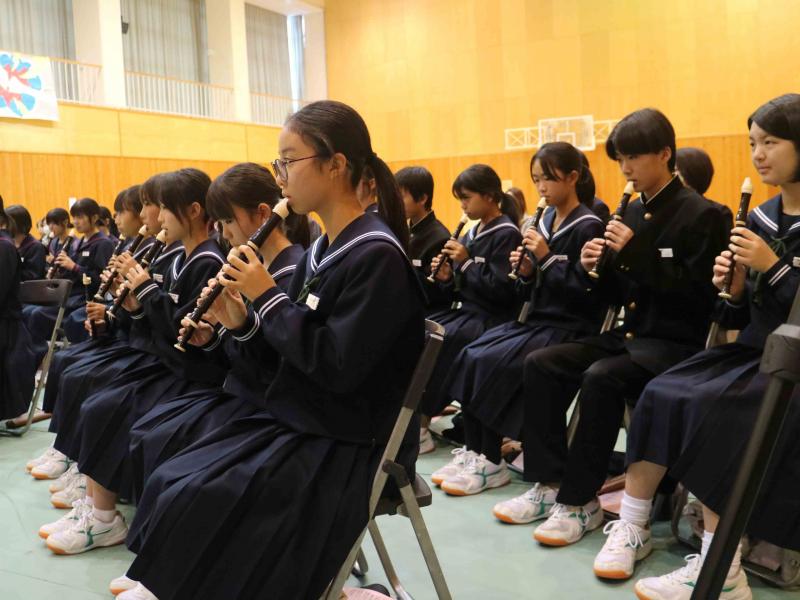 能登町中学校1年生全員による「音楽の集い」を、能都中学校体育館で開催しました。ウオーミングアップとして各校の校歌を歌い、全員で「COSMOS」を合唱しました。次に、リコーダーで「いのちの歌」を合奏しました。特に合奏では松波中学校1年だけでソプラノリコーダーを吹いたので(他はアルトリコーダーです)、緊張していた様子でしたが、とてもきれいな音色になっていました。最後に、トランペットの角氏とピアノの白澤氏の演奏を鑑賞し、そのパフォーマンスに生徒たちは魅了されていました。たっぷりと音楽に触れる時間になりました。
