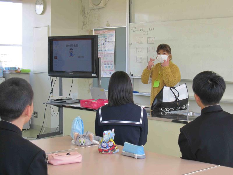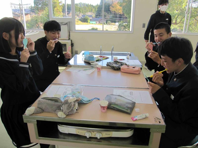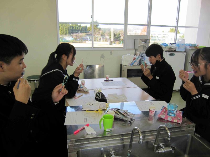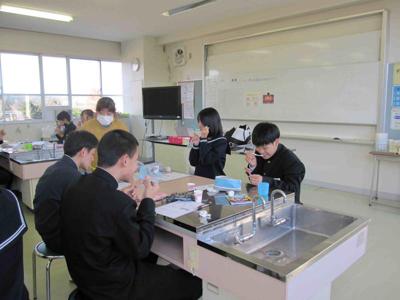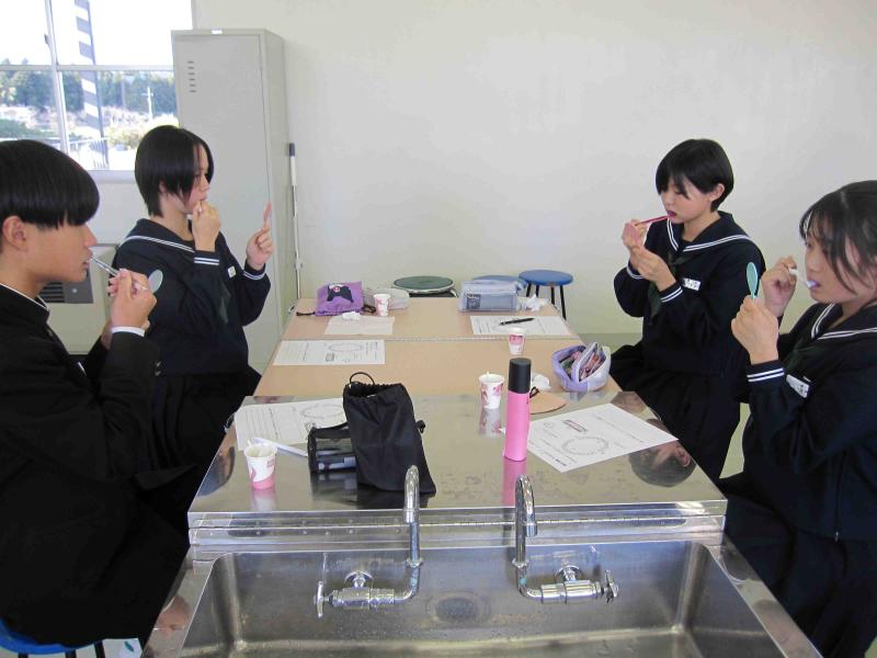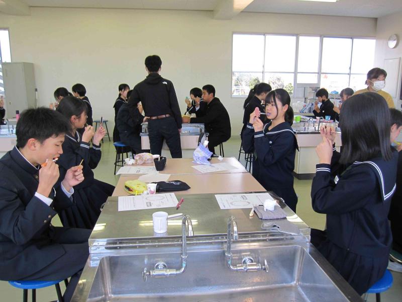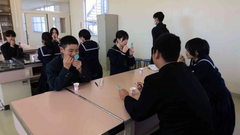 2年生は、歯科衛生士の小下さんを招いて「歯磨き教室」を実施しました。歯磨きを怠るとむし歯や歯周病になり、それが全身に病気をもたらすことがあることなど、歯磨きの大切さを聞き、「どうやって磨けば歯垢はとれるだろう」を課題に、一人一人の歯に合った磨き方を工夫しました。染め出された歯垢をきれいにするため、手鏡で見ながら、真剣に磨いていました。生徒たちは磨き残し0をめざし、今日実践した磨き方を思い出して磨いていきたいと話していました。