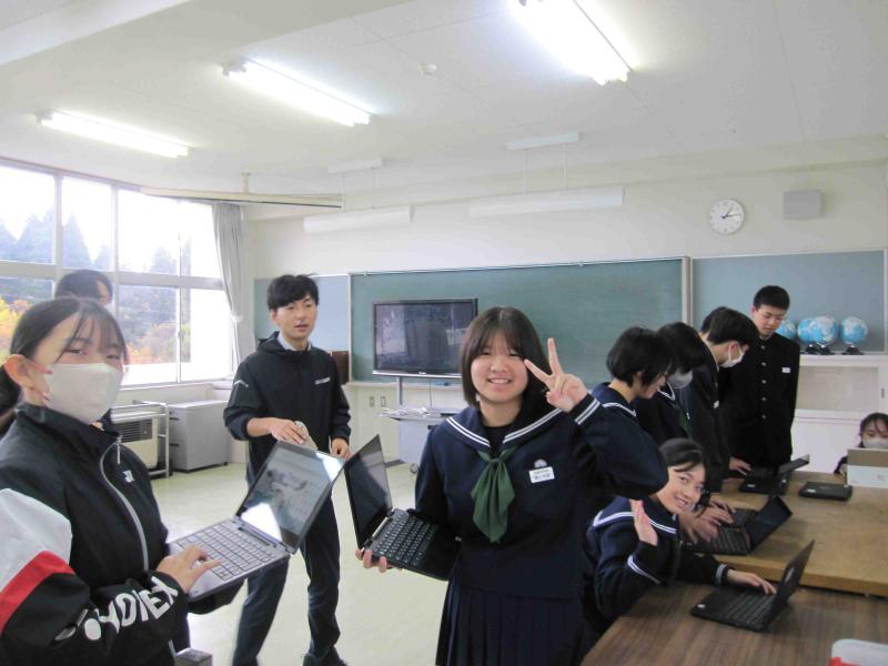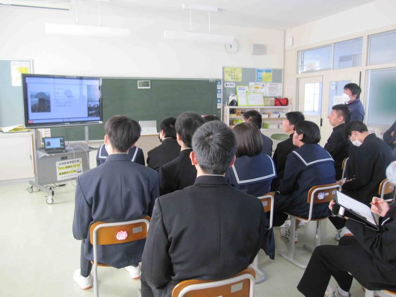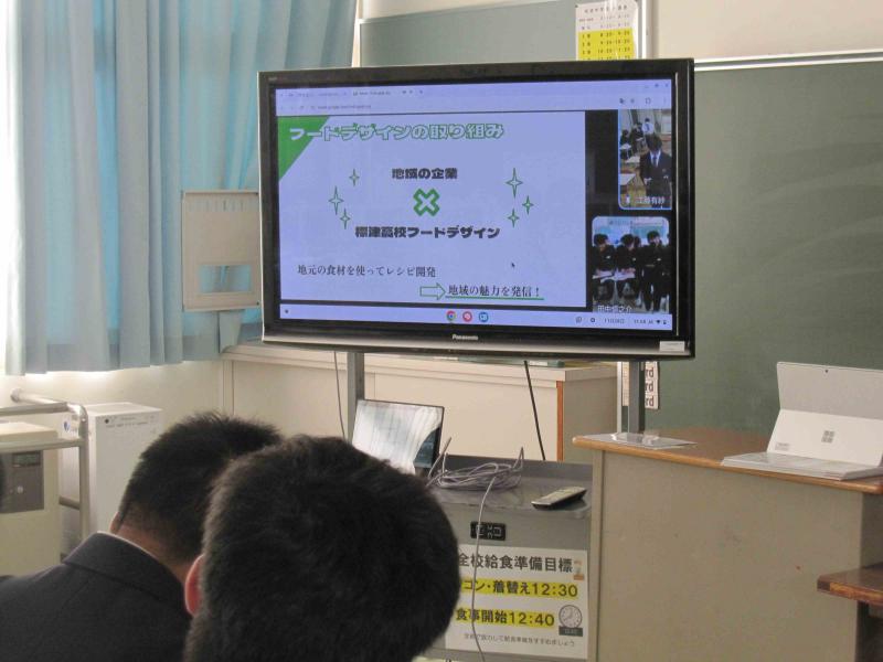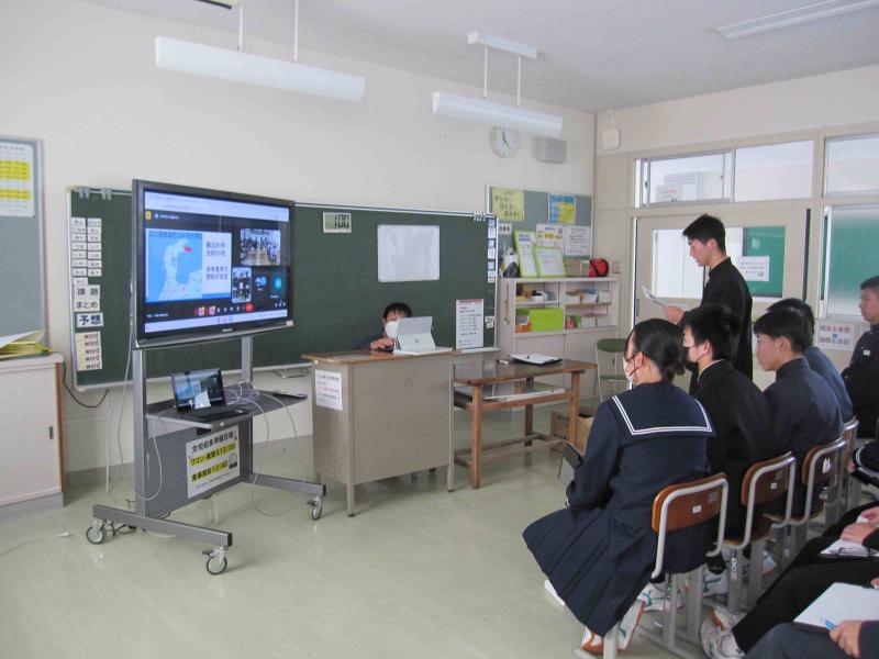 3年生は「のとかけ」の販売をきっかけに、北海道の標津高校の生徒の皆さんとオンラインで交流することができました。それぞれの学校から学習の取り組みを紹介し、地元産の食品を活用した製品作りについて聞きました。高校生の皆さんからの発表では、クイズが出され、それを解きながら楽しんで聞くことができたので、良かったです。また、標津高校では、海産物だけでなく酪農や農作物を活用したものなど、たくさんの製品開発に取り組まれていて中学生にとって、とても参考になることばかりでした。ありがとうございました!