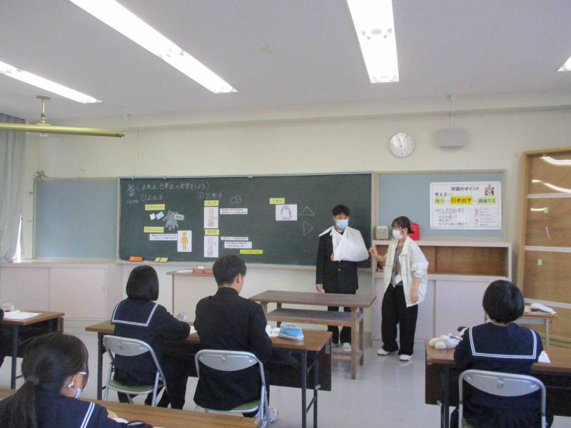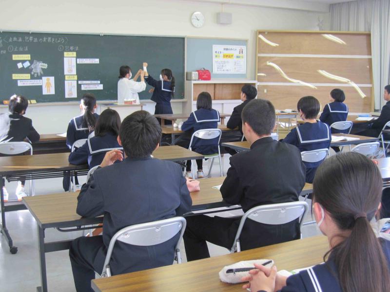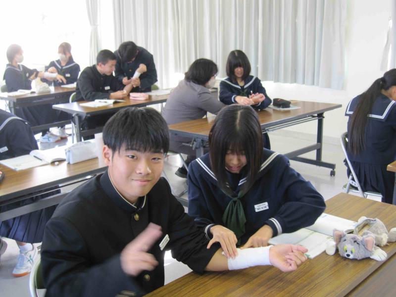 2年生は、保健体育科の授業で応急手当てについて学習しました。養護助教諭がTTとなり、止血法や包帯や三角巾の実物を使い、実際にやってみました。互いにアドバイスしながら、包帯の巻き方には2種類あり、怪我をしている部分をしっかりと固定し緩まない方法を体験し、感心している様子でした。緊急時に慌てずに手当するためにも実際にやってみることが大切だと感じていました。