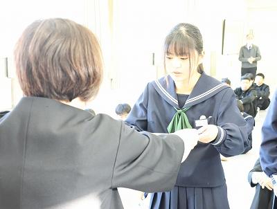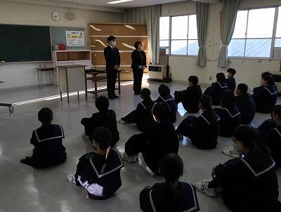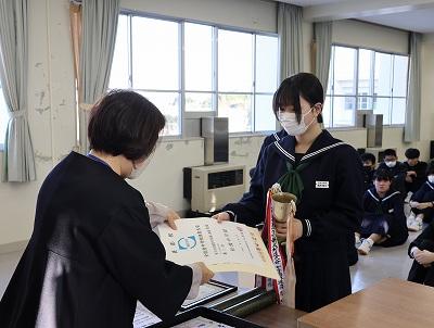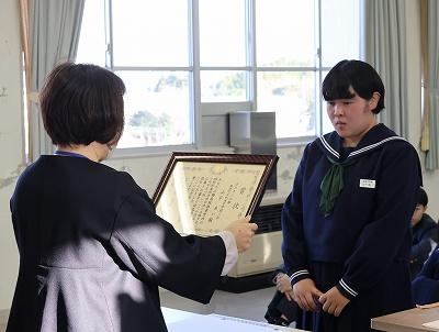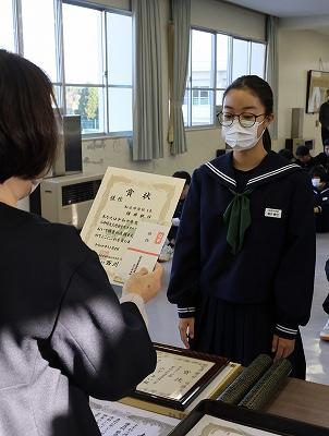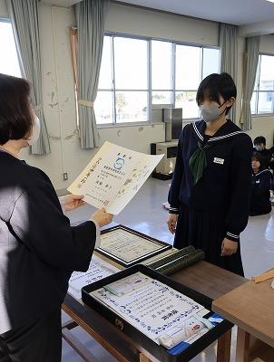 夏休みの応募作品の結果が、続々と届いており、絵画、作文、ポスター、書道作品の表彰を行いました。表彰式がこれからのものも含め、随時結果が届き次第、表彰していきたいと思います。同時に能登地区新人剣道大会の納賞も行いました。文化面、運動面ともに、生徒たちの頑張りが成果につながっています。また、教育実習生の紹介も行いました。