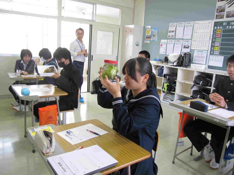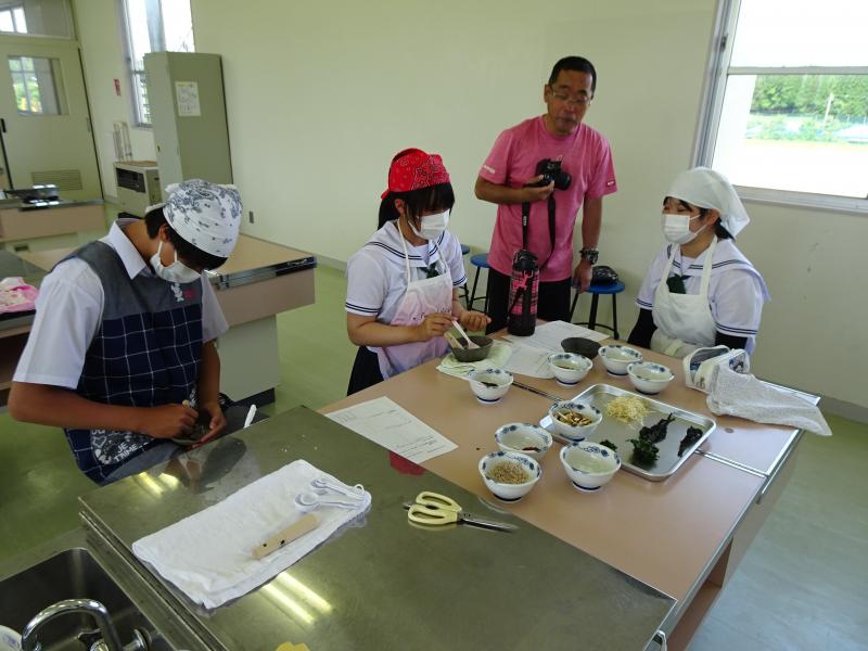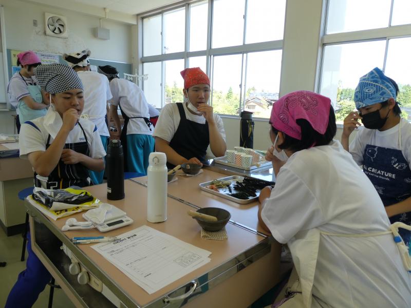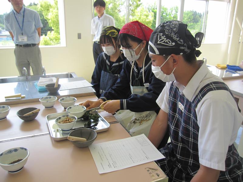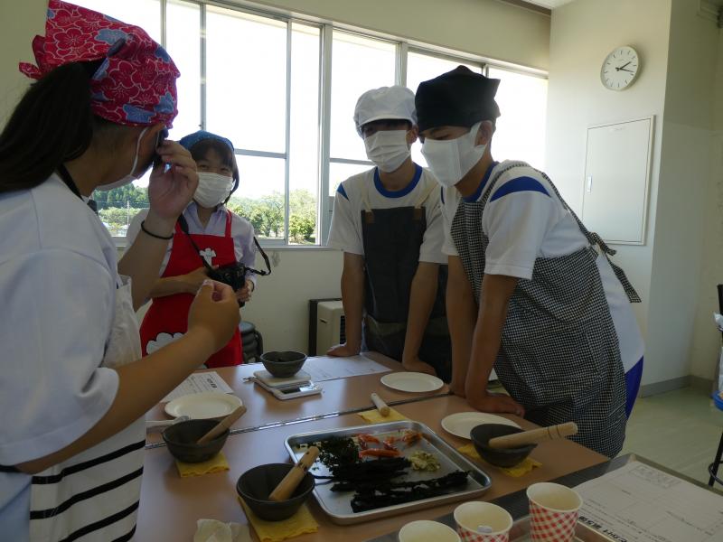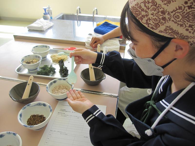 3年生は海洋教育のテーマ「海を活用する」に沿って、今年もふりかけづくりに挑戦します。海産物を主材料として、オリジナルのふりかけを製作販売していきます。生徒たちは、能登の海をPRすることに加え、自分たちが頑張っている姿を発信することで、地域の皆さんを元気にしていきたいという思いを持っています。先日、能登里海研究所やフードコーディネーターの方と一緒に材料の組み合わせを考えました。実際に材料を細かくし、数種類混ぜ合わせ、試食してみました。それぞれのグループから提案がありましたが、多数決で一つの味に決まりました。今後は、パッケージデザインやPR方法とその内容について話し合っていきます。