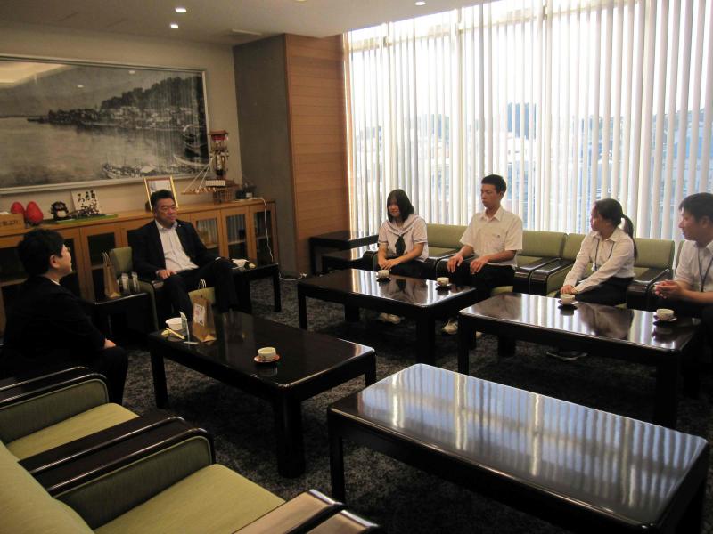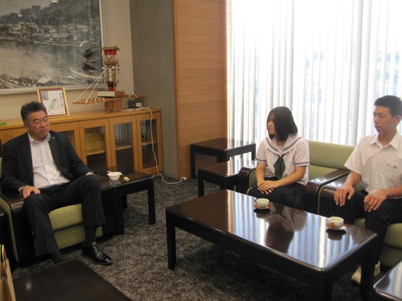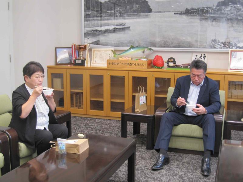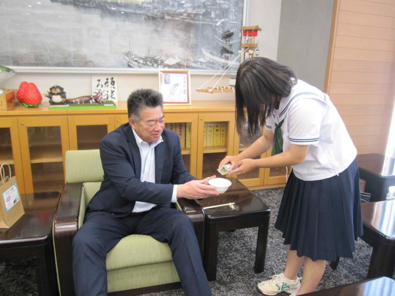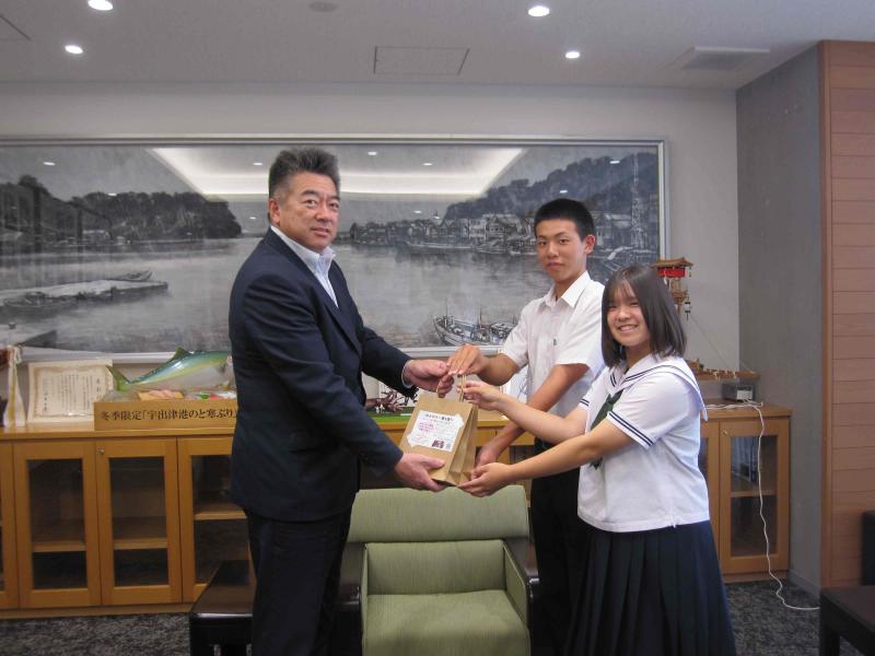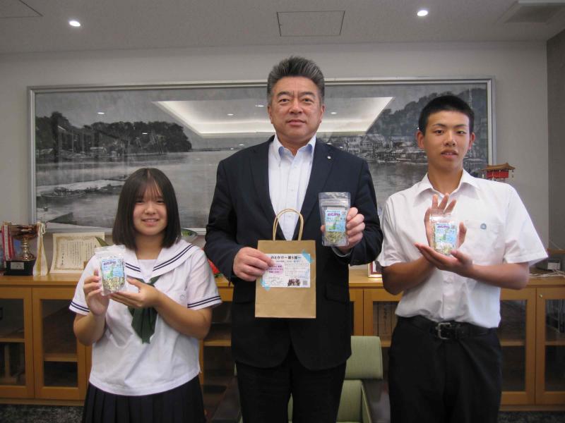 3年生が海洋教育で制作した「のとかけ」(能登産の材料を使用したふりかけ)の完成を吉田町長、眞知教育長に報告しました。緊張の中、3年生代表2名から、ふりかけにこめた思いをお伝えし、実際に試食していただきました。生徒たちは、目の前で試食していただきながら感想を聞くことができたので、報告できてよかったと話していました。