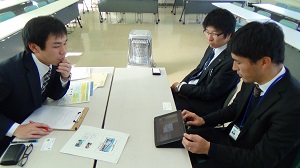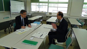 北海道音更高等学校の先生が本校にご来校され、AL型授業、「主体的・対話的で深い学び」、文部科学省「高校生の基礎学力の定着に向けた学習改善のための調査研究事業」、本校の特色ある取り組み等について情報交換を行いました。本校からは、基礎学力定着推進委員の国語科米林教諭、数学科免田教諭、外国語科木戸口教諭からも、各教科の授業改善や学力スタンダード等の取り組みについて説明しました。特に、外国語科のiPadを活用したデジタル教科書による授業についても情報交換でき、とても実践的で有意義な研究会となりました。今後も、交流を進めて行きたいと考えています。