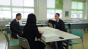 2018年2月14日 09時00分 宮城県立志津川高等学校の3人の先生が本校にご来校され、生徒の学びの意欲を喚起し、基礎学力定着を図る取組、家庭学習習慣の定着を図る工夫・取組、「学力スタンダード(指導計画)」に係る工夫及び効果、Classi活用等について情報交換を行いました。お互いの学校の成果と課題、宮城県の高等学校教育の現状等も聞くことができ、とても有意義な研究会となりました。
