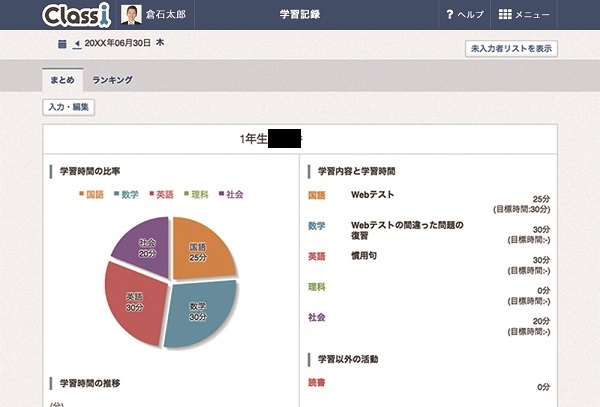 夏季休業に入りましたが、今年度は「Classi」の学習記録とコミュニケーション機能で、1、2年生は各自の生活リズムや家庭学習時間を入力・分析し、振り返り学習を行っています。3年生は、今後も家庭学習時間等調査を行い、個人推移票で自己分析を行っていきます。