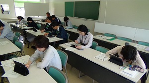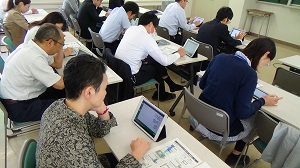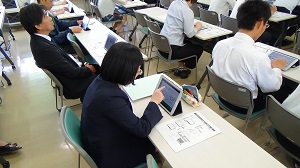 今回は、「iPad、STUDYNET活用授業について」というテーマで、アクティブラーニング型の授業改善を目指した研修でした。