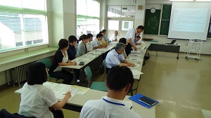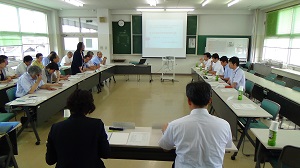 高知県立高知丸の内高等学校の先生方が本校にご来校され、文部科学省の指定研究事業、授業改善、基礎学力定着等について情報交換をしました。研究会の後は、授業参観をしていただき、「主体的・対話的で深い学び」やICT活用授業についてご助言をいただきました。
