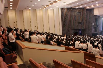 生徒はゴスペルの美声を聞くとともに演者がステージから手を振ると、振り