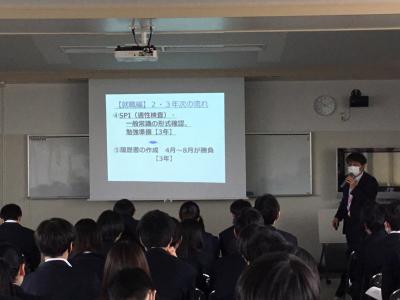 2024年4月23日 16時57分4月23日(火)、本校進路指導主事の村井先生が、2年生の4月段階で知っておかなくてはならないこと、進学事情、就職事情、進路決定の考え方等について説明しました。今回の説明会で、生徒の皆さんには2年次で進路の方向性をしっかり決めるよう話しました。5月28日(火)に進路ガイダンスがあります。大学・短大、専門学校、企業の話を直接聞く機会があります。その時間を有効活用できるように現時点での自己分析をしっかり行ってください。