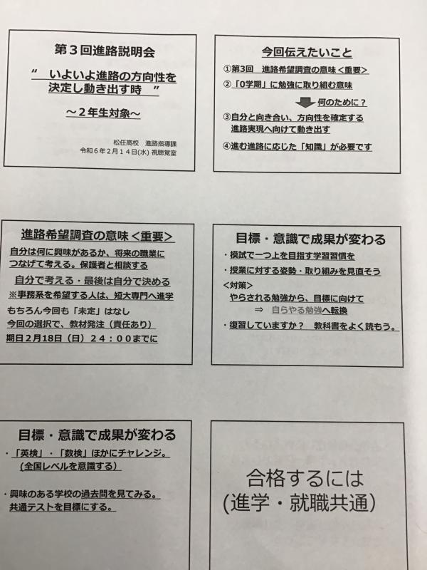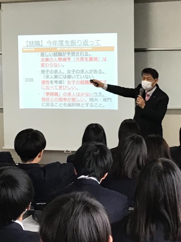 ~いよいよ進路の方向性を決定し動き出す時~。このタイトルの通り、第3回進路希望調査で自分の方向性を決める時期となりました。「自分で進路を考え決定する」ことは進路決定に当たって前提となる考え方です。適切に判断するためには、しっかり情報を集め、ボタンの掛け違いをしないことが大切です。周りの協力も必要です。例えば保護者の理解は欠かせない条件となります。今回の進路希望調査は、自分の方向性を決めるリミットとして設定されています。自分の将来の進路にしっかり向き合い、納得のできる選択をしてください。進路指導課村井先生が、具体的な取り組み方や考え方を含めわかりやすくお話ししました。レジュメを見直し、前進できる選択をして今日からでも行動に移してほしいと思いました。入力期日を守り、責任ある進路選択をしてください。皆さん頑張りましょう。!!