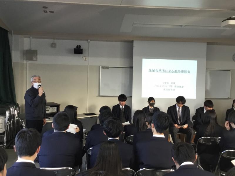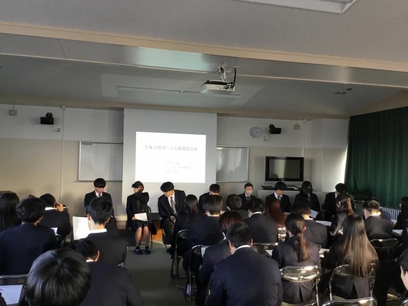 2年生を対象に標記座談会を実施しました。パネラーは今年度進学・就職を決めた8名です。