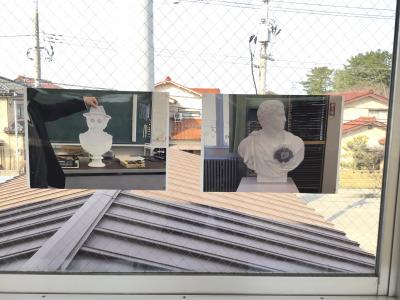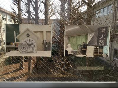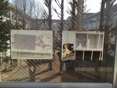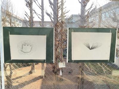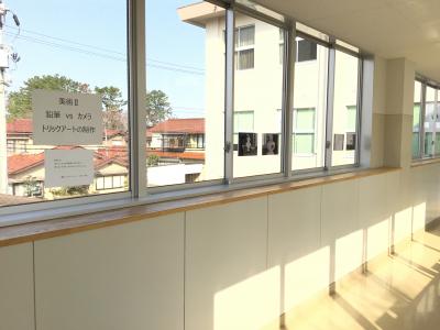2年生美術選択者の作品を2階渡り廊下に展示しました。