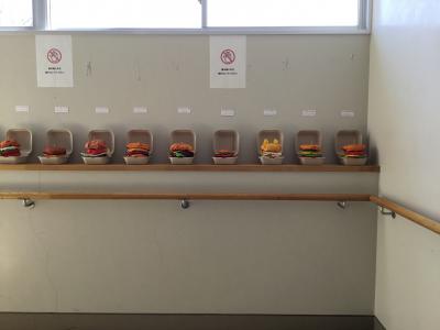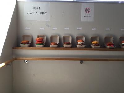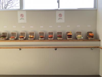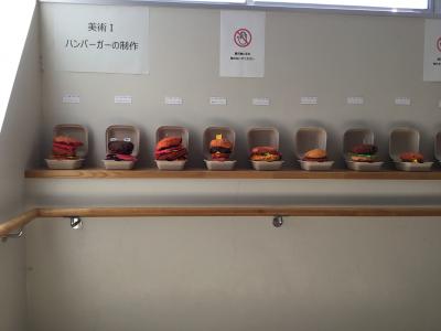 1年生は、新聞紙とコピー用紙を使ったハンバーガーの立体作品です。