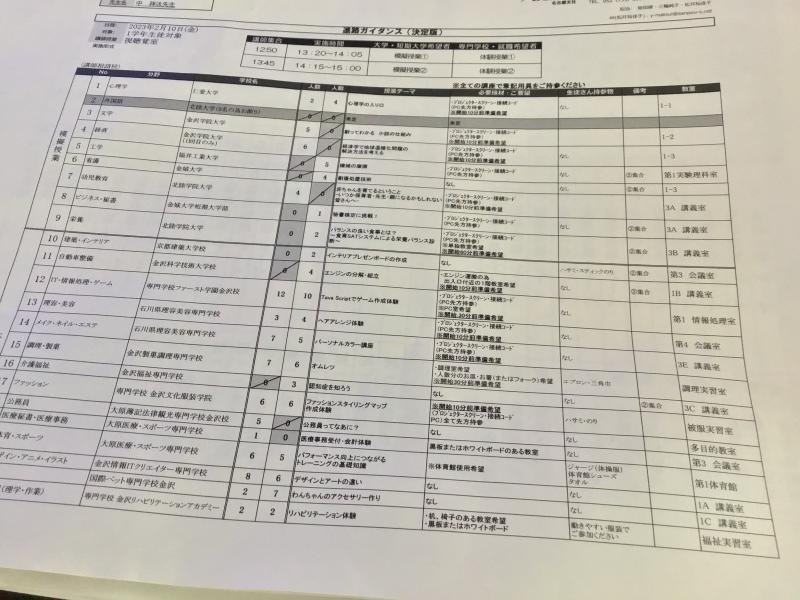 昨日に引き続き、2/10(金)1年生を対象とした標記ガイダンスを実施しました。内容は分野に分かれて模擬授業を受けるというものです。生徒は、興味・関心のある分野2つを選び、その内容の説明を受けたり、実習を体験するものとなっていますす。心理学や経済、IT・情報・ゲーム、メイク・ネイル・エステ、ファッション、体育・スポーツ、デザイン・アニメ・イラストなどに人気が集まっていました。職種の観点、学部・学科の観点から考える機会になればと思います。楽しいことばかりではなく、専門性を高めるという観点から体験、学習してほしいと思いました。自分の進路は自分で考え、保護者の理解を得て決めるものです。自分の責任において決める姿勢を学んでほしいと思います。ご指導いただいた各学校の先生方ありがとうございました。