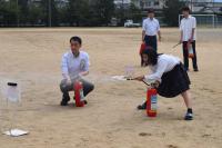 また、避難訓練後には、消火器の使い方の指導と煙中体験も行われました。初めて煙の中での歩行を体験する生徒も多く、「煙の中を歩く体験をして思っていたよりも前が見えなくて実際に火事になったときこんな中を歩いて逃げなければいけないと思うと、建物から出ることはすごく難しくて、常日頃から防災グッツやハンカチなどを持つことが大事だと思った。」(3年)、「煙の中を通る体験を初めてしたけど上の方が煙がたくさんあることがわかった。火災のときは口と鼻を覆って移動しようと思った。」(3年)、「煙の中は白くて見えにくく、煙を吸わないようにしようとしても、吸ってしまうことを知りました。」(1年)などの感想が、今回の体験を通して、火災時に取るべき行動について生徒一人一人がよく考える機会となりました。