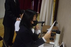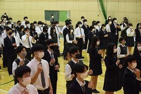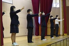 今回の記念式典では、感染症対策のため校歌を大きな声で歌うことができなかったため、JRC部の協力の下、校歌を手話で表現することにし、全校生徒で練習をしてきました。みんな歌うことはなかなかしづらい状況ではありますが、みんなで一丸となることができました。