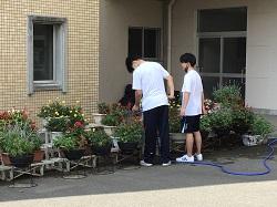 暑い日が続きますが、プランターの花々は枯れずに咲いています。環境委員やJRC部の生徒が、夏休み中も水やりに来てくれているからです。