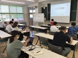 研修は、出かけていき直接受講するものもありますが、最近はオンライン研修も増えてきました。また、校内でも若い教員が講師になって勉強会のように行うICT研修も何回か行っています。2学期からの授業に活かせるよう、お互いに教え合って、頑張っています。