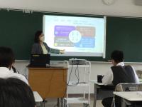 総合学科生活・福祉系列の生徒19名が社会福祉法人 自生園の西場芳江さんから介護の仕事、高齢者福祉の現状と課題についてのお話を伺いました。「介護の仕事は3K(きつい・汚い・危険)と言われますが、私は38年携わってきて3K(感謝・感動・可能性)の仕事だと感じています」とおっしゃっていたのが印象的で、介護現場の様子から仕事の魅力が十分に伝わってきました。また、今後40年間、要介護者は増加し、被保険者は減少し続けると知り、不安に感じましたが、地域共生社会の実現に向けて私たちにできることがたくさんあることにも気づきました。ほんの少し周りに目を向けること、例えば「最近、隣のおばあちゃん見ないけど…」「新聞がそのままだ…」などの日頃から「気に掛け合う」というゆるい見守りが大切だということを学びました。