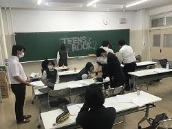 6/15(水)3限目の調理室の様子です。温めた牛乳にレモン汁を加えています。料理をしているのではなく、タンパク質の酸変性の観察実験です。牛乳に酸を加えると白い沈殿(カゼイン)と透明な液(ホエイ)に分かれることを観察しました。溶けていたタンパク質が酸で凝固するのを確かめました。