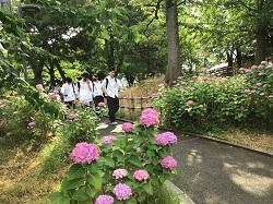 松任駅方面からの登下校ルートに、おかりや公園があります。木々が陰になり少し暑さがやわらぎます。季節の花や草木の緑も目を楽しませてくれます。7月に入り、そろそろ紫陽花も終わりです。