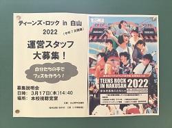 「TEENS ROCK in白山」は今年度初めて開催予定の高校生アマチュアバンド選手権です。この事業は一般社団法人白山青年会議所が主催で、事業の主目的は青少年育成です。学生スタッフと白山青年会議所のメンバーで実行委員会を組織し、広報活動、クラウドファンディング、審査員の選定、当日の司会進行など経験する中で、社会で必要な力を育む場を提供します。初年度の今年は、白山青年会議所より松任高校にお声かけいただきました。