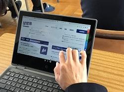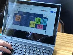 新県知事の政策をWebで調べ、良いと思ったものなどをPC上で付箋に書き出し、その理由を入力しています。お互いのスライドを見られるよう設定してあるので、友達の意見を知ることができます。
