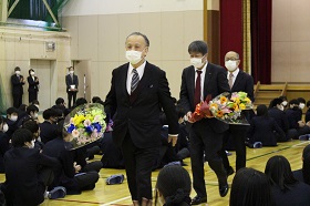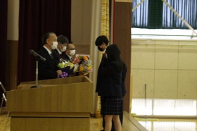 終業式後、離任式が行われ、10名の先生方が別れを告げました。続けて、退任式が行われ、野口博史先生、山田進先生、藤澤久志先生の退任が告げられました。
