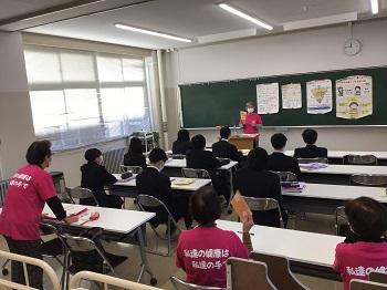 2,3年生のフードデザインの授業で、白山市食生活改善推進協議会の方に講義して頂きました。この協議会は食生活改善を目的に幼児から高齢者まで食育活動を実施していらっしゃいます。朝食、野菜の摂取、塩分についてなど、日頃の食生活を振り返り今後の改善に向けて勉強しました。例年であれば調理実習もして頂いていますが、コロナの影響で、講義のみとなり残念です。