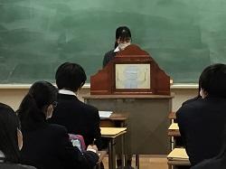 2021年12月16日 15時07分総合学科、生活・福祉系列の授業の1つである「子どもの発達と保育」の授業で、手作り紙芝居の発表が行われています。