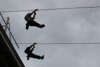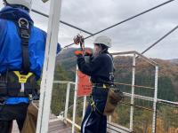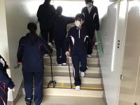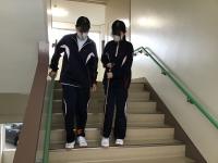 手足の不自由を感じるように「重り」を巻き付け、杖を使って階段の昇降を体験しました。