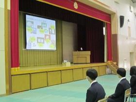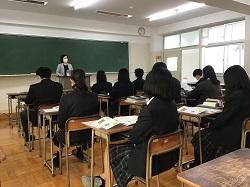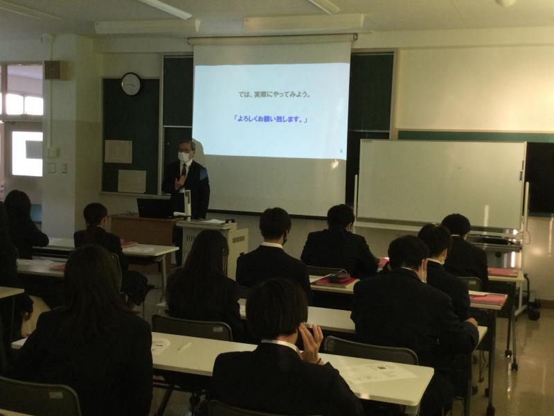 11月17日(水)7限の「総合的な学習の時間」に標記講座を実施いたしました。ゲストスピーカーはジョブカフェいしかわの森田 浩様です。ビジネスマナーの5つのポイントについて教えていただきました。身だしなみや挨拶が新人には特に大切という指摘をいただきました。敬語の遣いかたも勉強になりました。