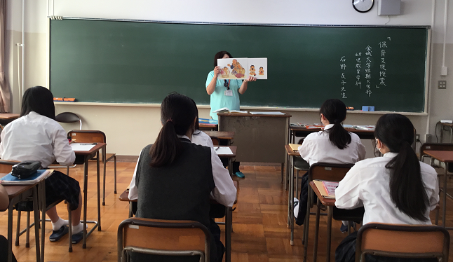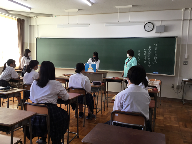 2021年9月30日 10時30分9月24日(金)に、家庭科の「子どもの発達と保育」科目で、金城大学短期大学部幼児教育学科の保育支援授業を受けました。この事業は今年で4年目になります。昨年度に引き続き、石野 友子先生にお越しいただきました。本校では、例年、近くの松任幼稚園に訪問して手作りの紙芝居を読み聞かせることをとおして、幼児とのコミュケーションを深める活動を続けています。そこで、今回も、紙芝居の制作にあたって、絵本との違いや演じ方の工夫について授業をしていただきました。