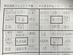 放課後、部活動を見回っていたときに、フェンシング部の練習場で部員のマンダラチャートを見つけました。大谷翔平選手も、高校時代にマンダラチャートを使って今後どうなりたいかといった夢に対する思考を整理し、実行に移しています。部員達も目標に向かって頑張っています!