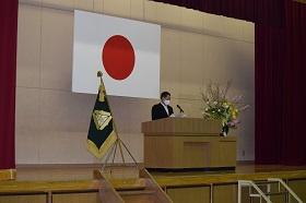式辞で佃和明校長は、大村智氏(ノーベル生理学・医学賞受賞)のことばで「この道を行くと大変だと分かっていたら、そこに向かいなさい。 そうすれば楽しい人生になる」を伝え、失敗を恐れず挑戦すること、やり抜くことが大事である、またGReeeeNの「遥か」の曲にある一節「気づけばいつも誰かに支えられここまで歩いた。だから今度は自分が誰かを支えられるように。」を紹介し、人としての思いやりを忘れず生きてほしいと卒業生にエールを送りました。