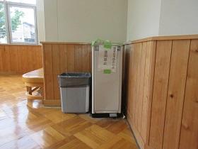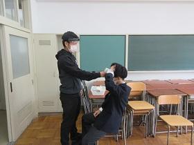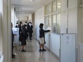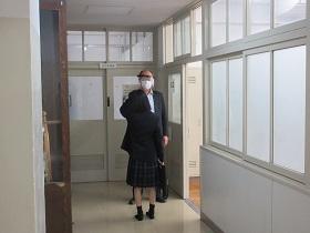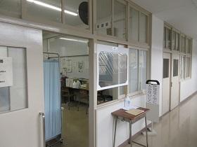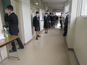 登校した生徒は、氏名や体温を書いた「健康確認チェックカード」を玄関前で提出し、中に入ります。カードや検温を忘れた生徒は、別室に移り検温しカードに記入した後教室に入ります。