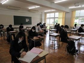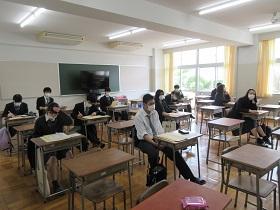 本日は3年4ホームを2つに分け、8教室で朝のショートホームを行いました。養護教諭からの新型コロナウイルス感染防止の注意事項を校内放送で聞いた後、課題や書類を提出しました。3年生は進路用の写真撮影を行いました。廊下で自分の撮影順番を待つ間も言葉少なに、2mのソーシャル・ディスタンスをとっていました。終了後は「Google for Education」の確認を行って放課となりました。