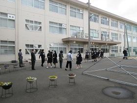 2年生の分散登校が本日行われました。昨日の3年生の登校と同じように、「健康チェック表」を提出し中に入ります。