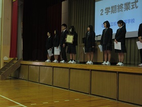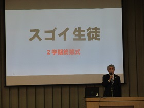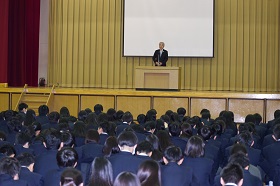 佃和明校長が、戊辰戦争で新政府軍に敗れ食うに困った新潟・長岡藩の藩士たちが、他藩から送られた米百俵を教育のために当てた話、そして県内の津幡町でも大正時代に老朽化した小学校を建て直すため、村人たちが禁酒してその費用を工面した話を披露し、「教育にはそれだけの価値がある。そして学ぶということは未来を作るということ。まとめの3学期をしっかりがんばってください」と訓辞されました。