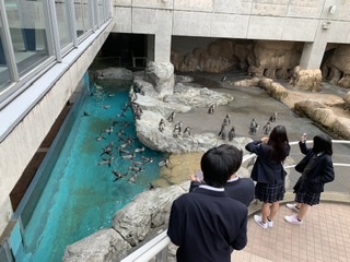 午前中はペンギン水族館へ行きました。朝早くに起きて眠そうだった生徒たちも、かわいいペンギンたちに癒されて眠気が吹き飛んでいる様子でした。