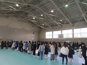 仮入学説明会が3月20日(火)に行われ、159名の入学内定者とその保護者が参加しました。卯野教頭を初めとして、各担当から入学後の生活や書類等のさまざまな説明がありました。その後、制服等の採寸、教科書やシューズ等の購入をしてもらいました。制服渡しは4月3日(水)13:00から本校で行われる予定です。